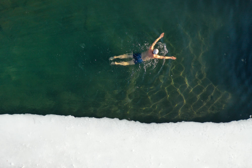↑1月9日,在扎兰屯市一处冬泳场地,一名冬泳爱好者在游泳(无人机照片)。新华社记者 李志鹏 摄