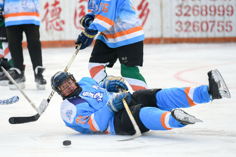 ↑1月9日,在扎兰屯市吊桥公园内,冰球爱好者在打冰球。新华社记者 李志鹏 摄