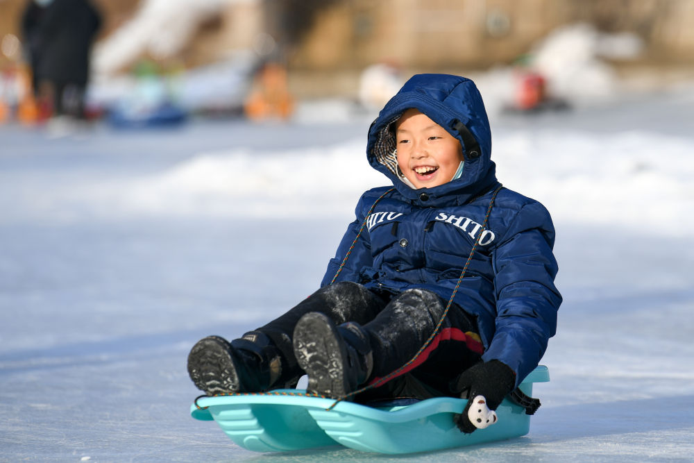 ↑1月9日,在扎兰屯市吊桥公园内,一名小朋友在体验冰雪游乐项目。新华社记者 贝赫 摄