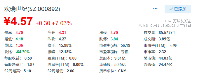 乐居财经讯 刘治颖 1月11日,截至收盘,欢瑞世纪(SZ000890)上涨7.03%,现报4.57元,成交额3.85亿元,总市值44.83亿元。