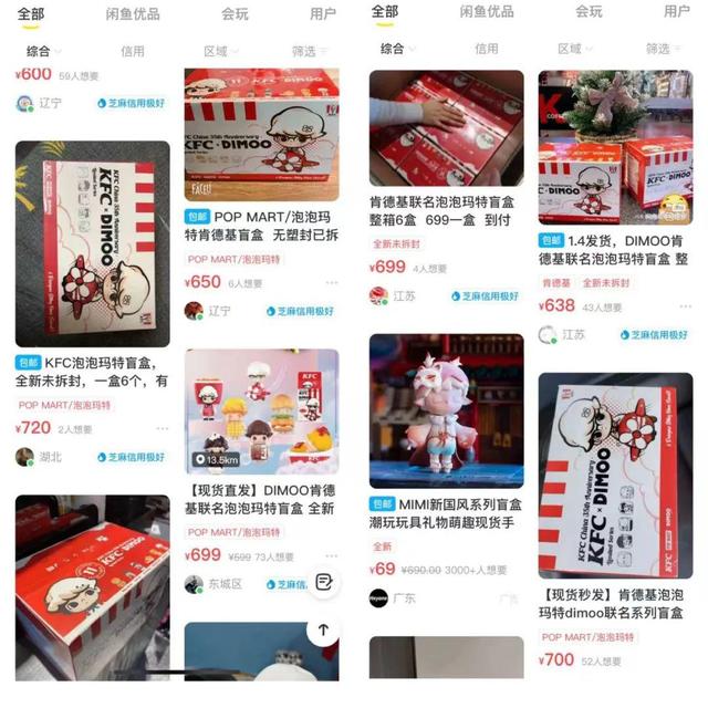 据报道,在二手平台上,该盲盒“货源”却非常充足。据不完全统计,至少有百余名卖家在售卖肯德基该款盲盒,部分还晒出整箱盲盒的图片。在某二手平台上,一套肯德基盲盒公仔售价被炒至600元至800元不等。部分隐藏款单个售价就高达800多元,较套餐价格上涨8倍。
