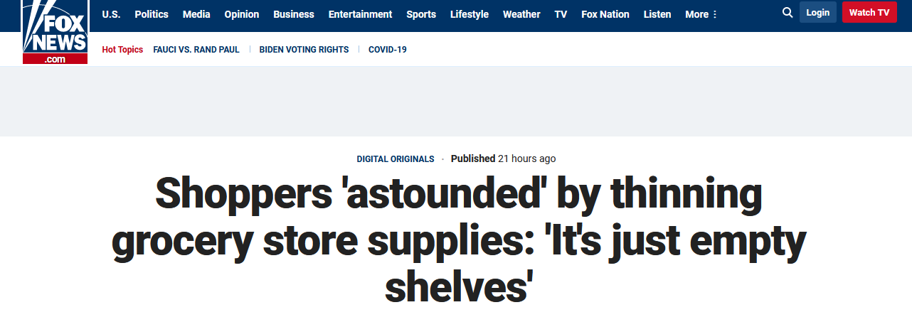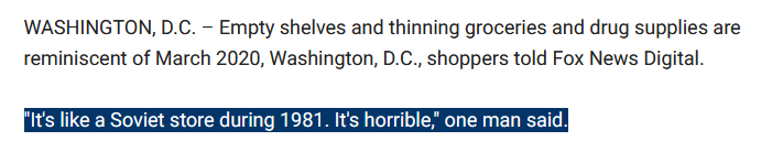 据福克斯新闻等美媒当地时间12日报道,本周美国各地的超市几乎都出现了物资短缺的问题,像牛奶、面包、肉、罐头和清洁产品等基本生活用品都很难找到,至少需要5个月才能缓解货物短缺问题。从华盛顿一家杂货店走出的男子直呼“可怕”,“这就像1981年的苏联商店。”