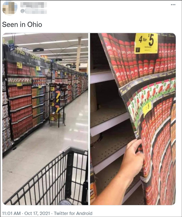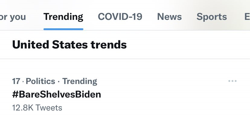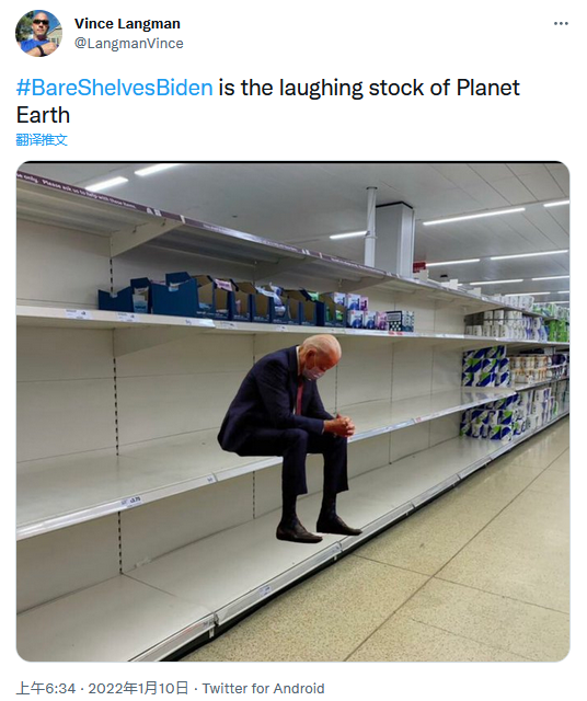 结果事到如今民众连基本生活用品都买不到了,这让美国消费者大为不满,在推特晒出各种恶搞拜登的空货架图片,标签#空货架拜登#(BareShelvesBiden)还登上了推特趋势。
