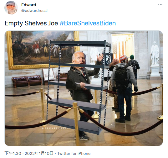 然而拜登过去却一直坚称已经解决了供应链危机,这让美国消费者大为不满,在推特晒出各种恶搞拜登的空货架图片,标签#空货架拜登#(BareShelvesBiden)还登上了推特趋势。