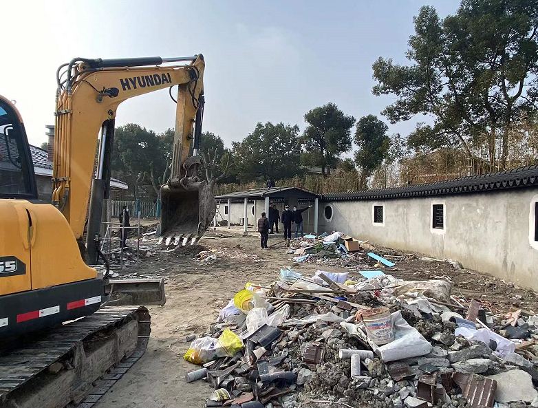 为了进一步确认房屋围墙部分的合法性,1月7日,城管中队向区规划和自然资源局发出执法协助函,最终明确了违法搭建部分。“实际上,这套房屋主体结构未涉及违建,主要是围墙部分及一处设备房属于新增违建。”张余说。确定违建性质后,拆除工作启动。