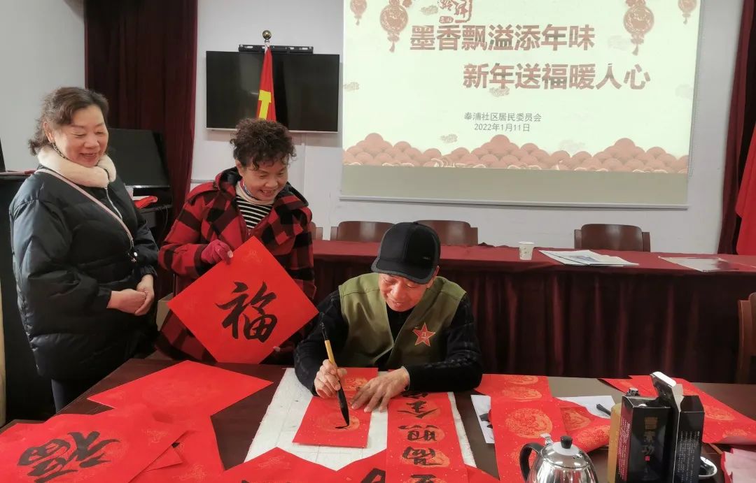 春联福字是新年的重要标志,写春联,送福字,透着墨香,洋溢着吉祥,更具浓浓年味和传统文化特色。过了腊八年味渐浓,奉浦社区党总支联合“乐龄先锋”家园老干部代表举行“墨香飘溢添年味新年送福暖人心”活动。