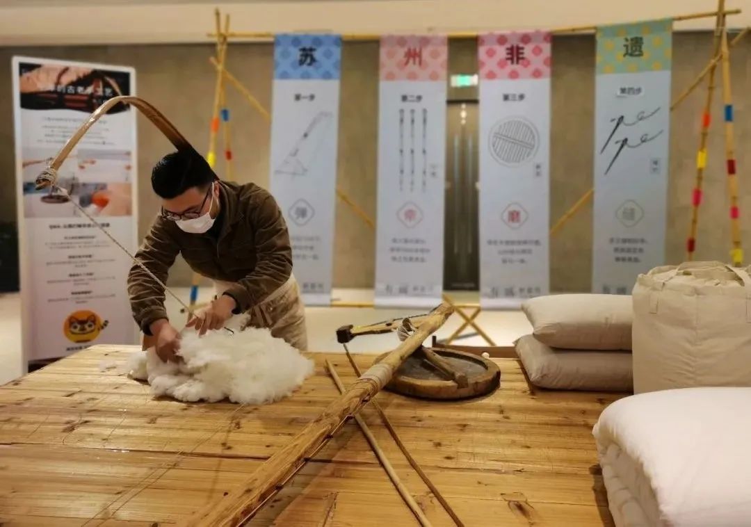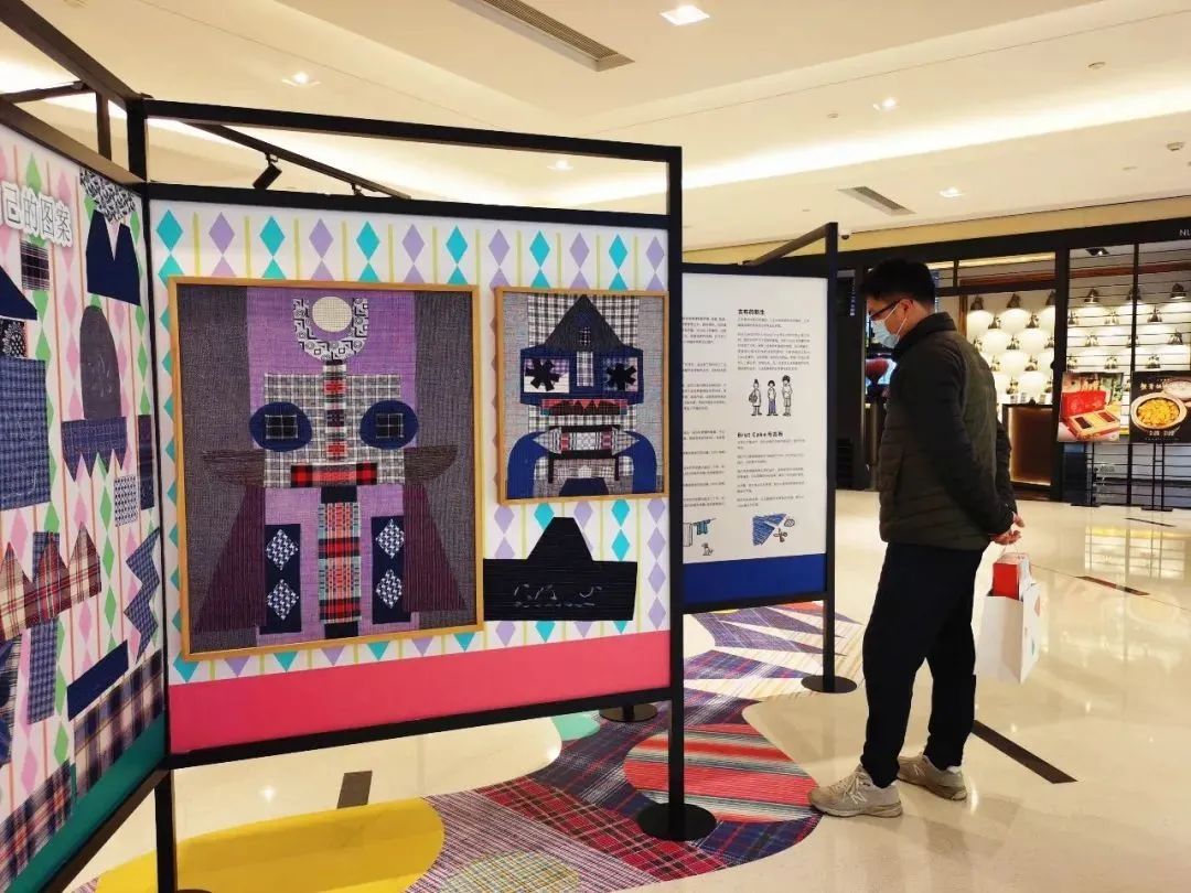 六楼为主展区,BrutCake与苏州非遗传承团队“有暖制被所”跨界合作打造了“温暖一被子”沉浸式空间,市民可在此欣赏江南手织老土布制成的拼贴画、新生儿百家被等创新艺术品,亦可了解传统手弹棉花被的技艺,现场将有专人进行展示。