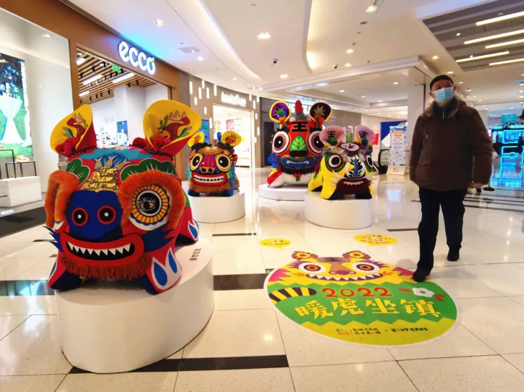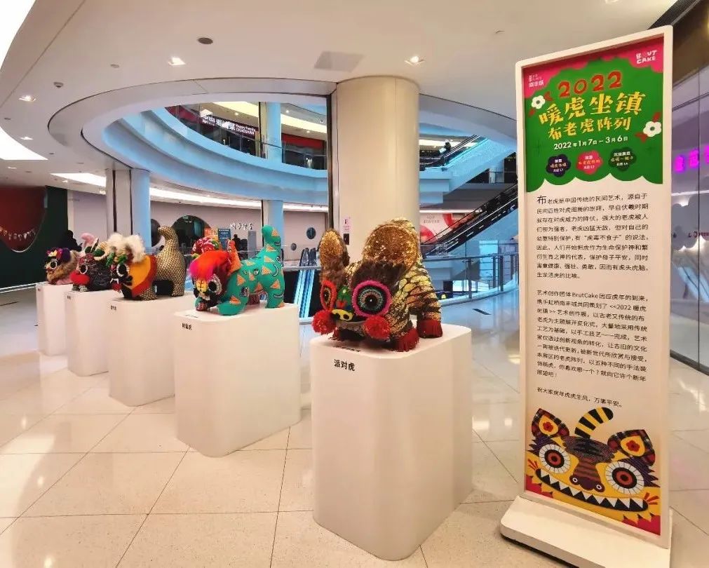 商场北区布置的“暖虎坐镇”艺术沉浸展由虹桥南丰城携手艺术家品牌BrutCake共同呈现,展览分布在北区一、三、六楼,所有展品均为手工制作,以传统工艺为基础,加入了艺术家的创新思维。