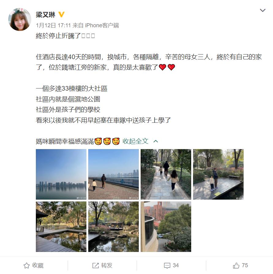 梁又琳在微博中提到,自己历经住酒店40天,和2个女儿在不同城市隔离,终于回到在杭州钱塘江旁的新家,并雀跃地介绍新家有多好,“一个多达33栋楼的大小区,小区内就是个湿地公园,小区外也是孩子们的学校,看来以后我就不用早起塞在车队中送孩子上学了”,从字句中就能感受到她有多喜欢他们的新家。