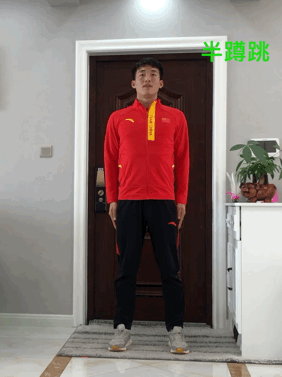 动作要领:抬头挺胸收腹,腰背平直,双手叉腰,两脚与肩同宽,脚尖平行向前;髋、膝、踝三关节同时屈曲与伸展进行连续半蹲跳。