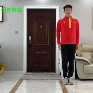 动作要领:抬头挺胸收腹,腰背平直,双手叉腰;单腿侧向跨出适当距离,稳定支撑身体重心快速屈曲踝、膝、髋三关节,另一侧腿膝关节伸直;重心完全移动至屈曲单侧腿后快速站立并腿,重复进行弓步侧移。