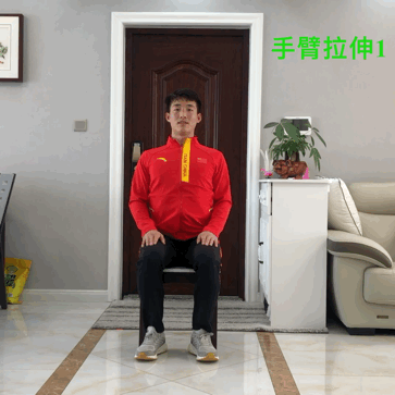 动作要领:腰背直立坐在椅子上,一侧手向上伸直然后曲臂触摸脊柱,另一侧手上举抓住对侧肘关节向同侧牵拉,同时头抵住大臂向后发力,保持一侧手臂牵拉数秒,然后换边。