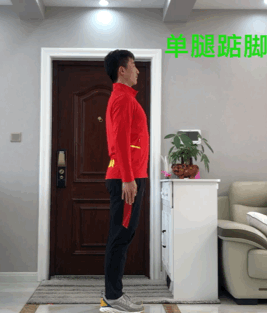 动作要领:单手扶墙,抬头挺胸收腹,腰背平直,一条腿直立稳定支撑于地面,另一条腿体系保持高抬姿势,进行支撑腿单腿提踵踮脚练习。