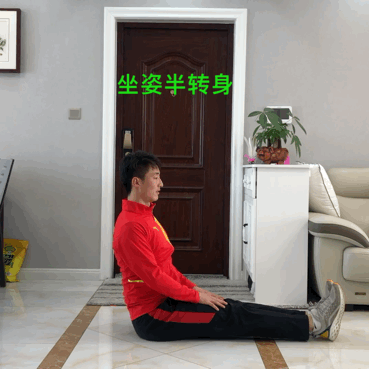 动作要领:双腿伸直坐于地面,右腿屈膝,脚放于左腿膝关节外侧,左手臂肘关节抵住右腿膝关节外侧,左手撑于身体后侧,腰背挺直向右侧半转,身体躯干并配合呼气加力。