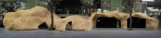 相较于被书籍和艺术品充盈的艺术之桥空间,在智慧湾科创园绿意盎然的小树林里,还有一座充满设计感的小屋——3D打印书屋,被作为艺术之桥空间的户外部分。