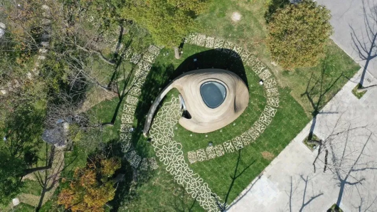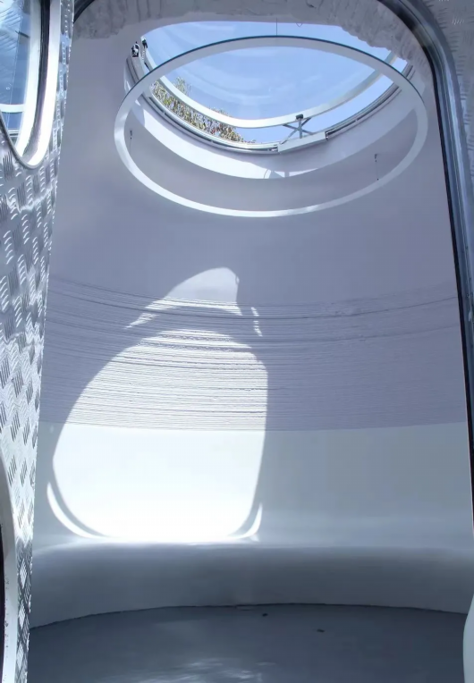 远远望去,形态极简的3D打印阅读小屋就像是一个太空堡垒;如果从空中俯瞰,它又像是书里的一个逗号。小屋顶部的圆形玻璃天窗可以打开,感受微风拂面,脚下则是贴心的地暖,在这里看书安静且舒适,可以尽情沉浸在文学的世界。