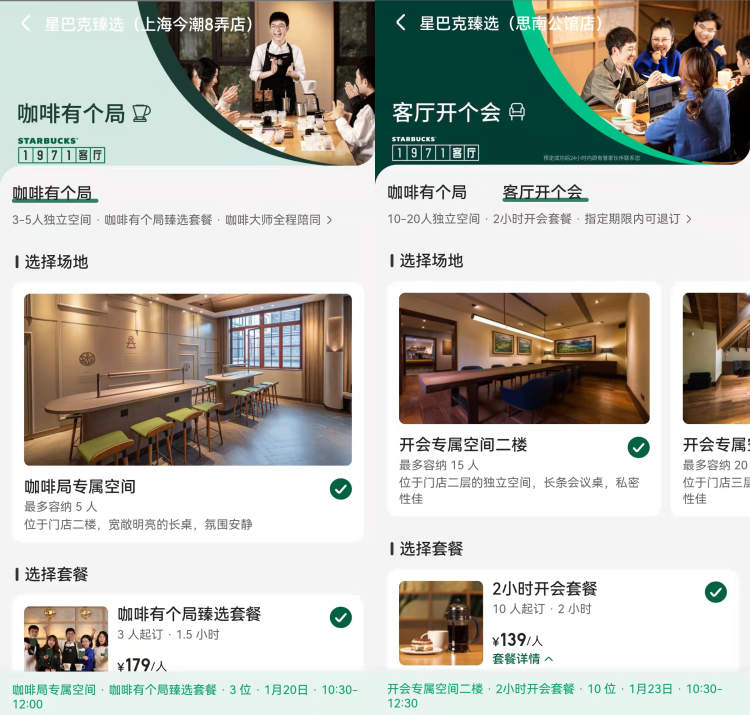比如,思南公馆店同时有“咖啡有个局”“客厅开个会”两种功能,进入相关页面后选择场地、选择套餐、选择时间及人数就可以预订了。