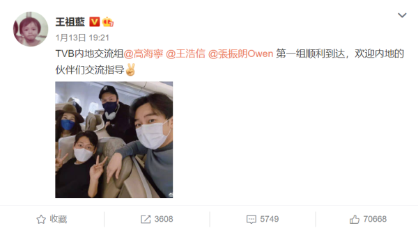 澎湃新闻记者注意到,1月13日,王祖蓝在微博分享了在机舱里与高海宁、王浩信以及张振朗的合照,并发文:“TVB内地交流组第一组顺利到达,欢迎内地的伙伴们交流指导。”网友们满满期待,网友纷纷留言:“这是要去哪里交流啊突如其来的惊喜”、“还会有第二组第三组吗”,还有网友提醒王祖蓝要注意安全:“可得注意安全,戴好口罩做好防护。”