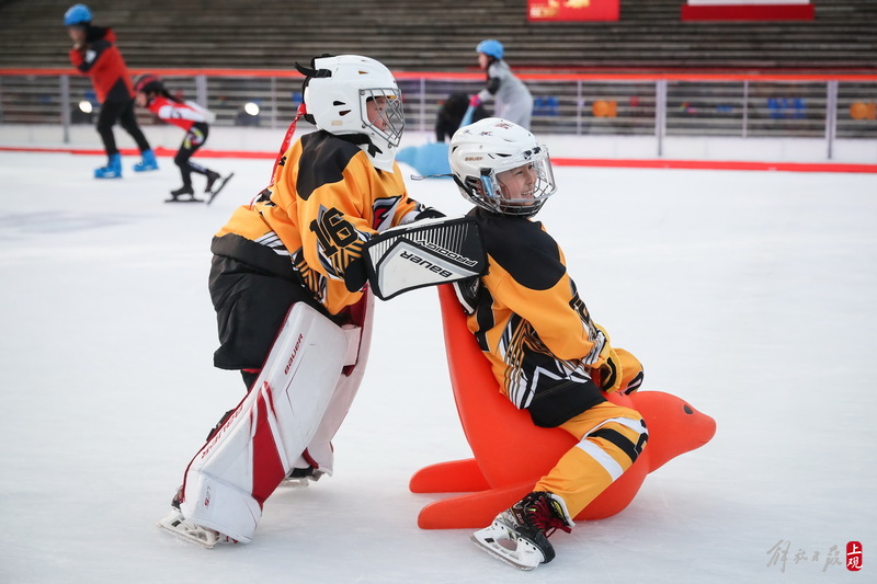 人们来到刚刚建好的东方明珠户外冰场,尝鲜体验冰上运动的魅力。