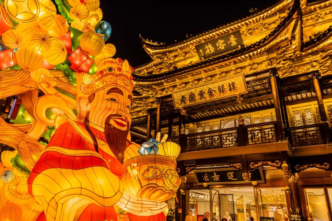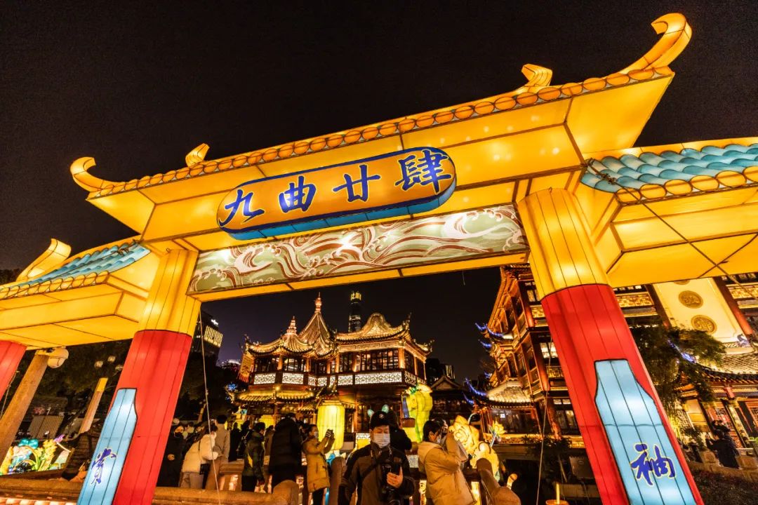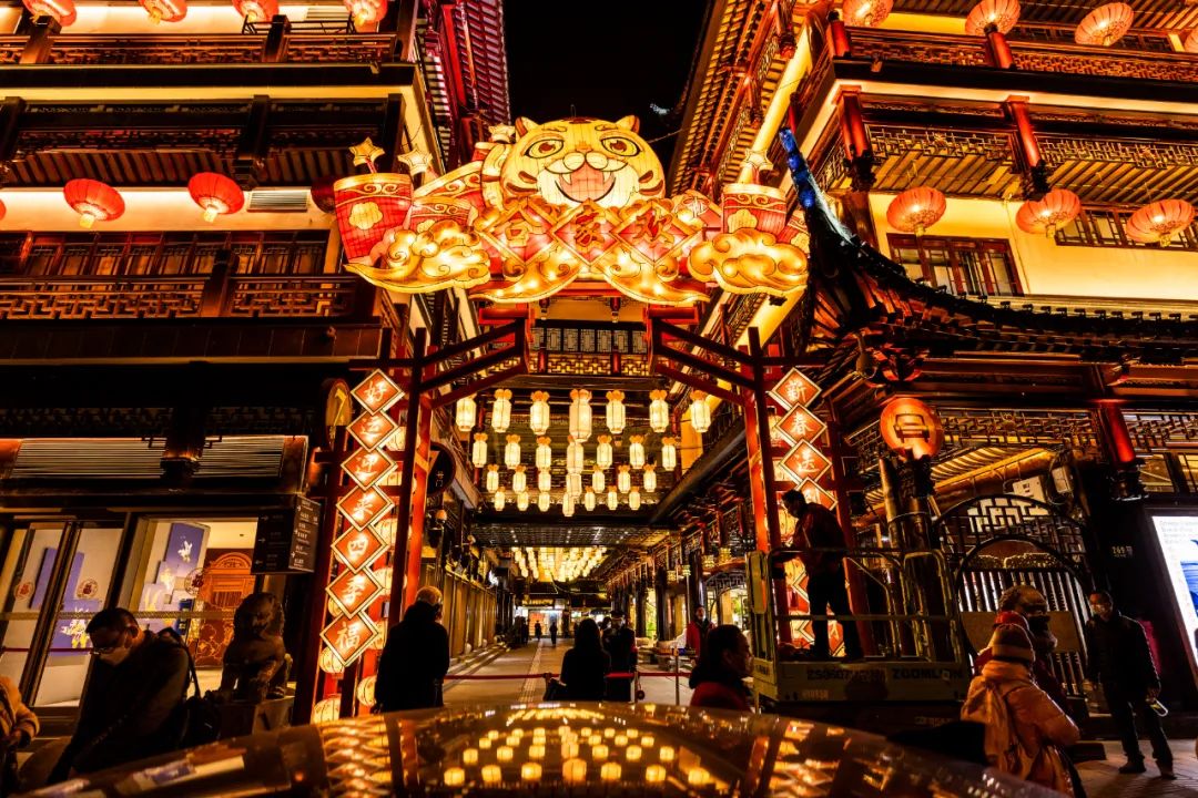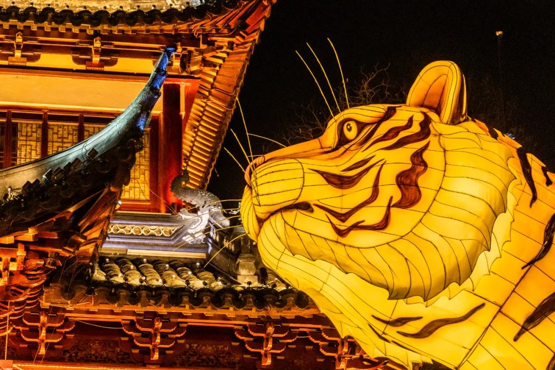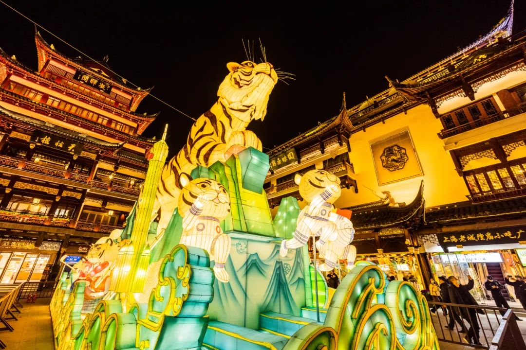 造型各异的生肖虎是豫园迎新春氛围中的重要元素,它们转场于中心广场、九曲桥广场和黄金广场之间,以国运祈福、城厢民俗和阖家欢乐为叙事线,装扮“虎跃东方”“九曲廿肆”“财神‘耶’”三大贺岁片区。