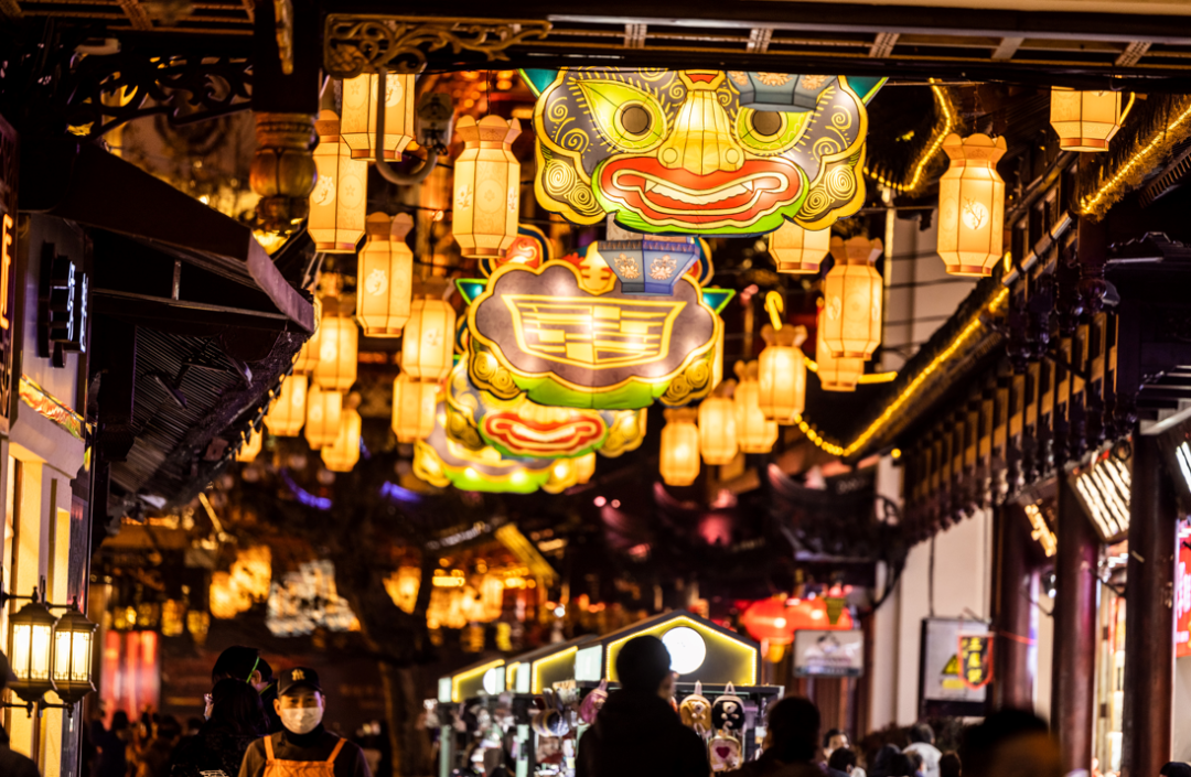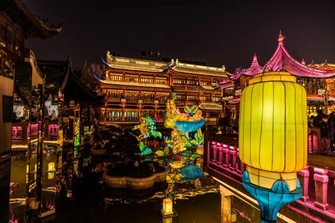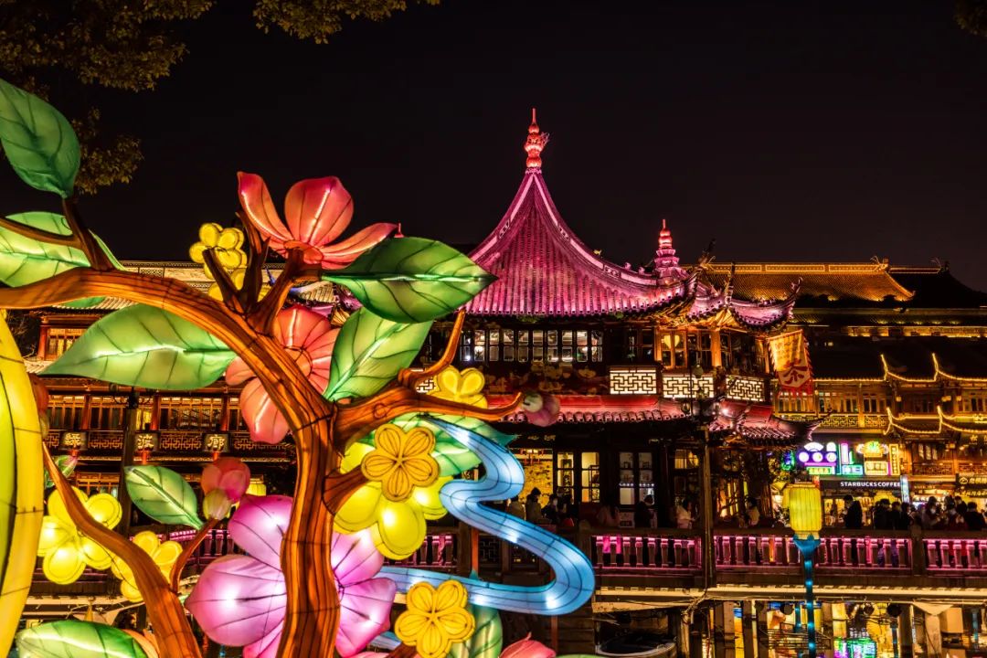 构思精巧的羊皮宫灯、海派灯饰、传统花灯、校场年画花灯被分别置于华宝楼、上海老街等点位。