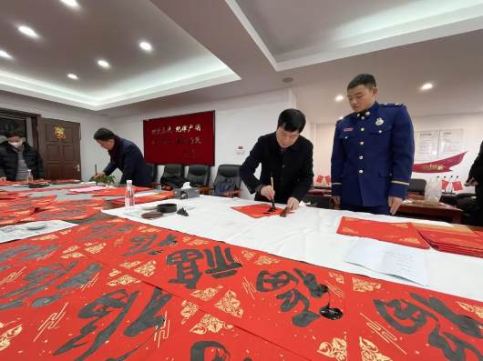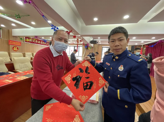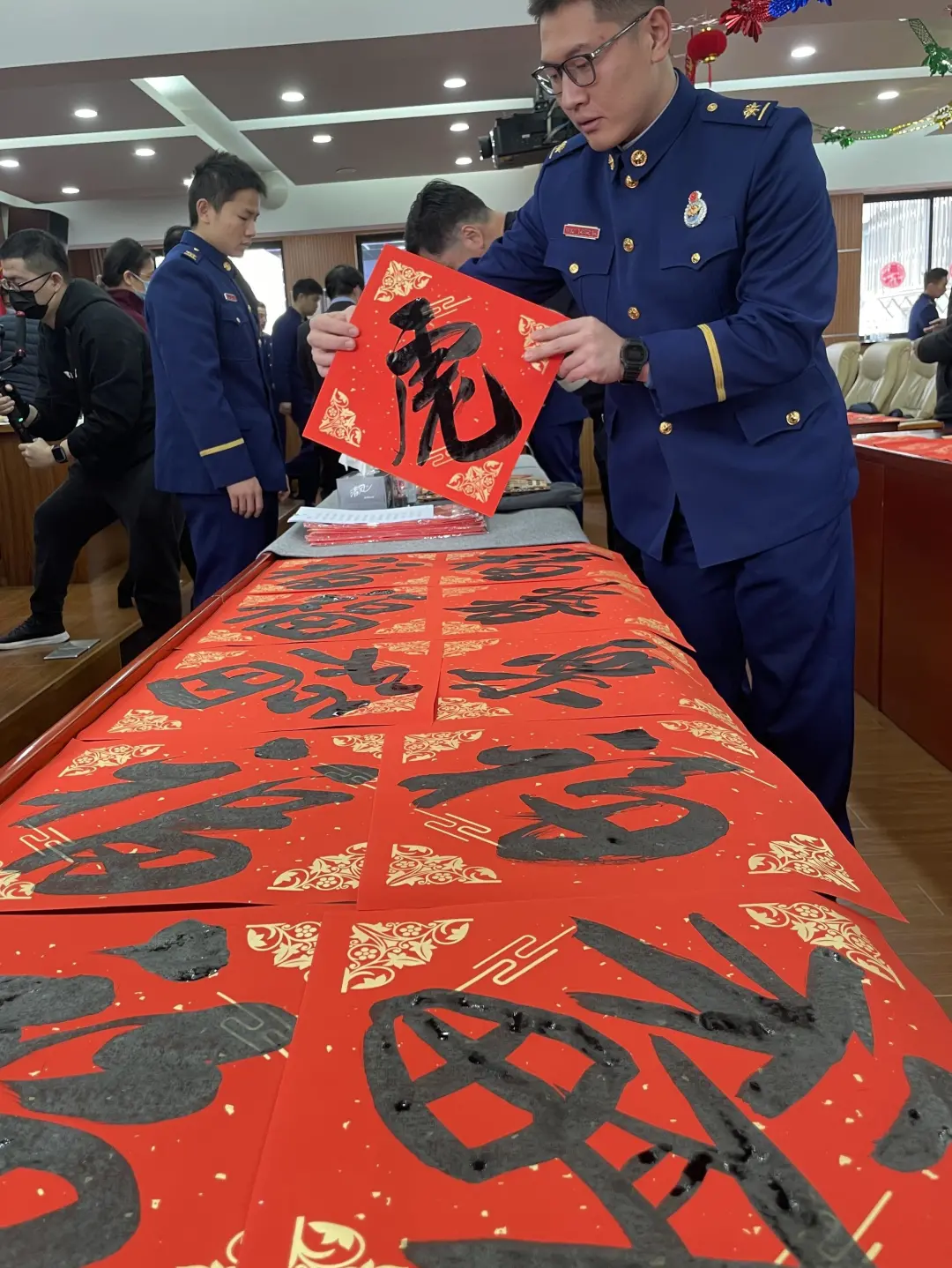 写福、送福,活动现场翰墨飘香。书法家们的字体各有千秋,有的苍劲有力、有的遒健飘逸,随着越来越多福字、春联跃然纸上,淡淡的墨香把吉祥和祝福送到了消防救援人员的身边,浓浓的幸福年味在消防站蔓延。
