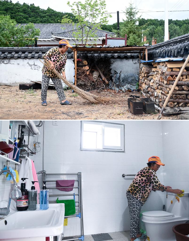 上图为图们市石岘镇水南村村民康顺姬在打扫院子里的旱厕旧址;下图为康顺姬打扫室内水冲厕所(2021年8月3日摄)。新华社记者颜麟蕴摄