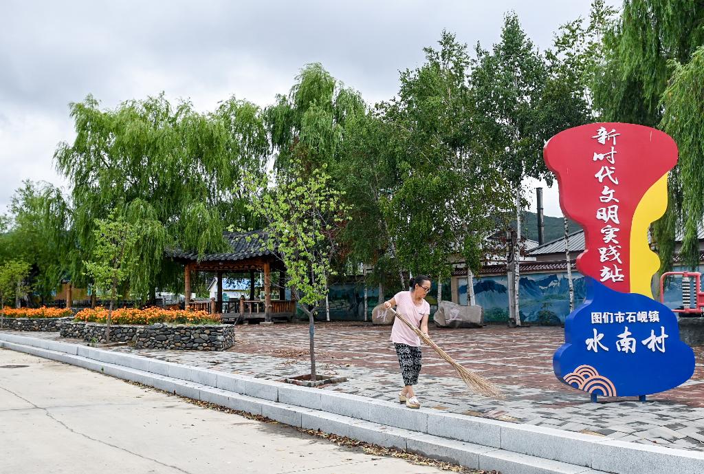 图们市石岘镇水南村村民在村子里的小广场上打扫卫生。(2021年8月3日)。新华社记者颜麟蕴摄