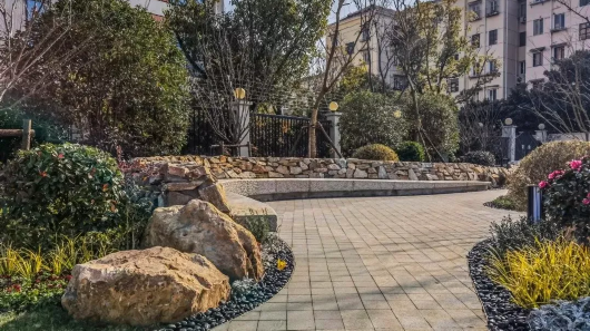 设计方以散置黑色鹅卵石作为园路与绿地的分隔带,勾勒出自然清晰的线条感;园林小品以特色垒石挡墙与坐凳相结合的形式为游人提供休憩与赏景空间。整个绿地以色彩、质感、休憩为主题,为喧闹的都市营造一处静谧精致的游憩之所。