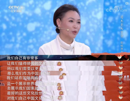 我国知名花滑运动选手陈露、李成江、庞清、佟健、张昊在央视四套《中国冰雪传奇》节目中再度聚首,谈起在花样滑冰比赛中中国传统文化的回归,他们也是倍感自豪。