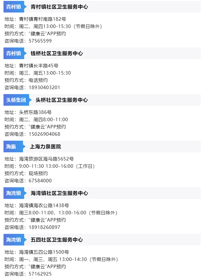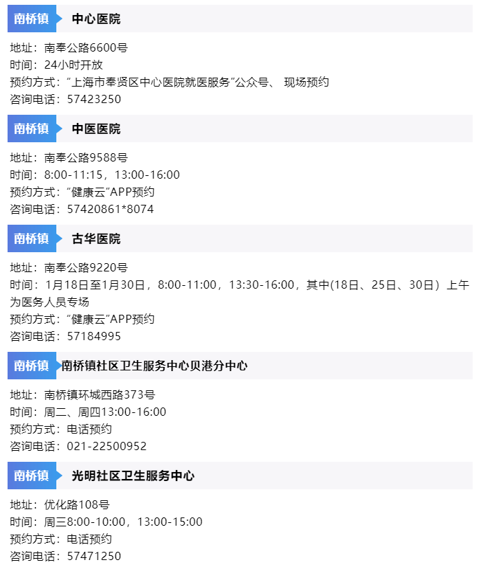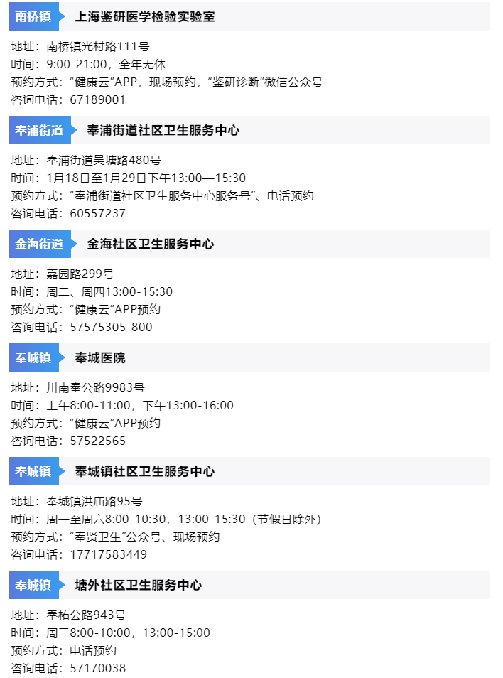 为应对核酸检测高峰,方便市民就近检测,奉贤区4家区级医院和20家社区卫生服务中心,及2家社会办核酸检测机构,在下列时间段开放预约核酸检测。