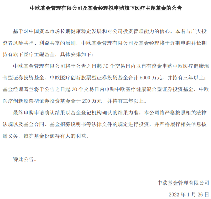 1月26日,中欧基金发布公告称,公司将于公告之日起30个交易日内以自有资金申购中欧医疗健康混合型证券投资基金(简称“中欧医疗健康基金”)、中欧医疗创新股票型证券投资基金(简称“中欧医疗创新基金”)合计5000万元,并持有三年以上。