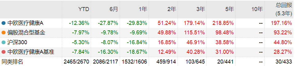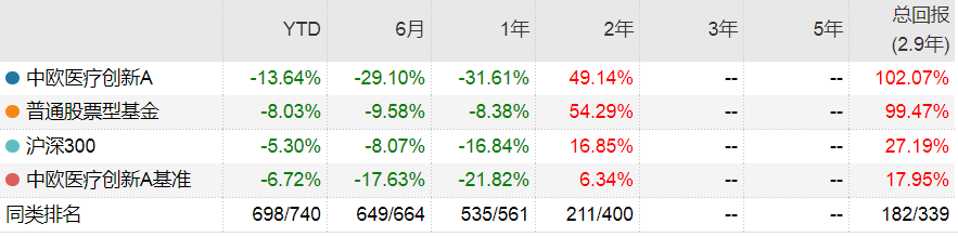 此外,中欧医疗健康A和中欧医疗创新A的今年开年的表现毫无起色,Wind数据显示,年初至今(截至1月25日),中欧医疗健康A累计收跌12.36%,跑输业绩比较基准同期-7.84%的表现,同类排名2465/2670;中欧医疗创新A累计收跌13.64%,跑输业绩比较基准同期-6.72%的表现,同类排名698/740。
