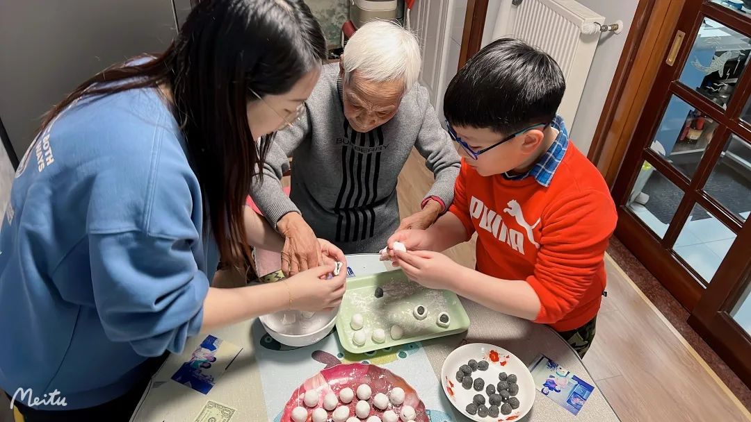 三年级一班的小朋友杜丞曦选择制作一份五彩水晶汤圆,准备了木薯淀粉、紫薯、红薯和南瓜等食材,从揉面团,到做馅料,全程亲自动手。看到忙活了一下午的成品时,她开心地和家人一起分享了起来。