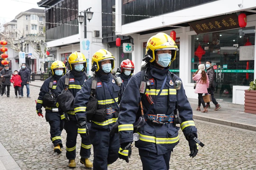 相较于平时,春节期间,消防队员的工作反而更忙碌。为了做好春节期间消防安全保卫,嘉定城南消防救援站还对人员密集区域加大防火巡查和日常监督管理,每天都有消防员前置驻防。何树军完成例行检查后,便马不停蹄赶往州桥老街驻防点与队员一同巡逻。