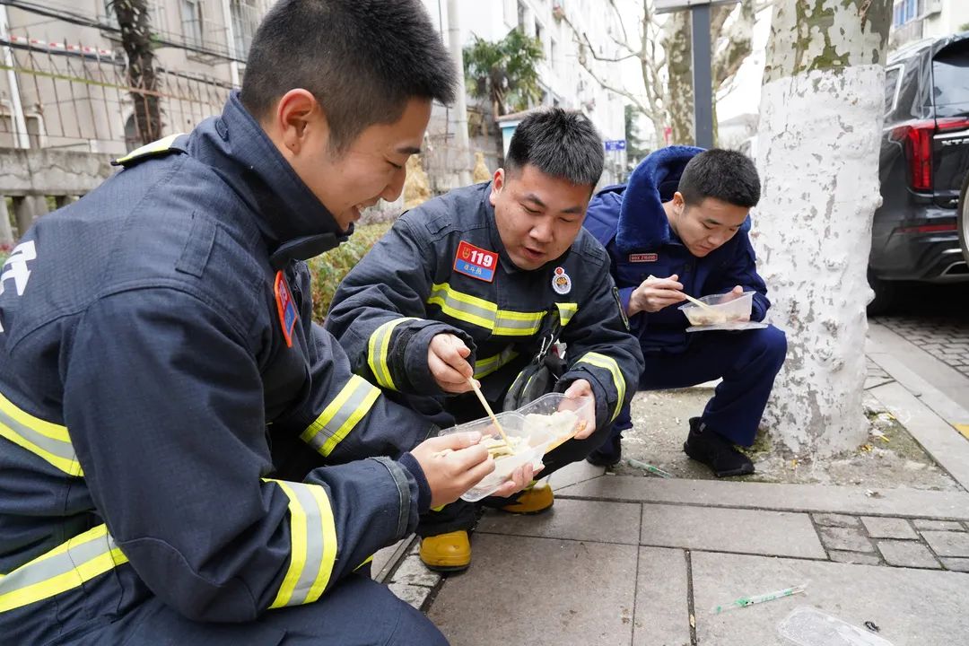 午时,结束一轮检查的驻防消防员蹲坐在路边,匆匆吃了几个象征着吉祥如意的饺子,便又开始新一轮的巡逻。