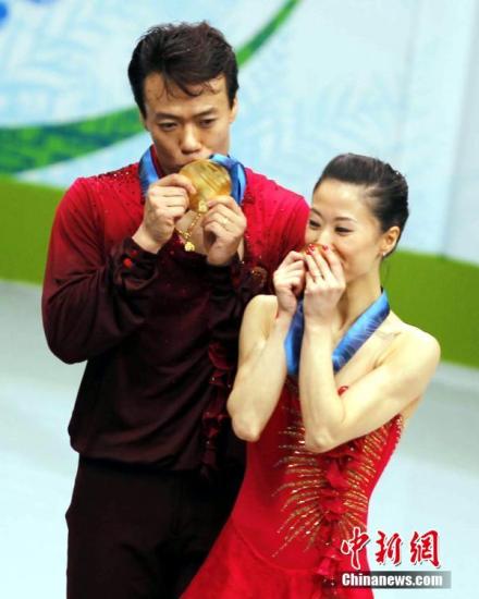 温哥华冬奥会花样滑冰双人自由滑比赛,中国选手申雪、赵宏博圆梦折桂。中新社记者 盛佳鹏摄