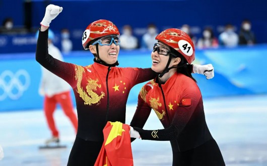 2月5日,中国队选手范可新(左)与队友曲春雨在比赛后庆祝。新华社记者 鞠焕宗 摄