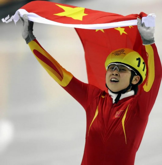 2006年2月15日,王濛在夺得都灵冬奥会短道速滑女子500米冠军后高举国旗庆祝胜利。新华社发