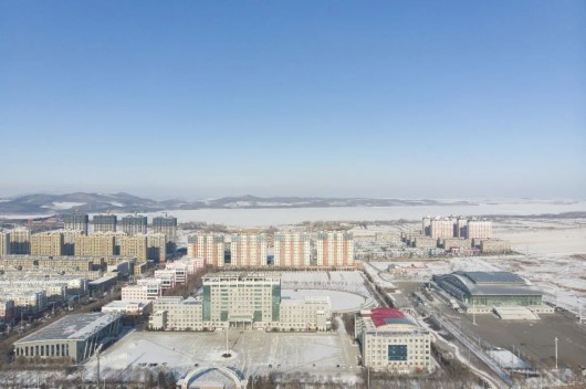 1月12日拍摄的七台河职业学院校园和七台河体育中心(右侧建筑)外景(无人机照片)。新华社记者 张涛 摄