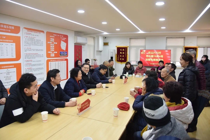 2022年2月7日上午,徐家汇街道乐山六七村居民区召开秀山路16弄4号既有多层住宅加装电梯推进签约会议。街道党工委书记万小岚,办事处主任张耀,办事处副主任吴洪良,办事处副主任康伟,人大工委副主任陈奎友,街道管理办、房管所负责人,单元楼加梯推进三人小组,居民代表和代建单位负责人参加会议。