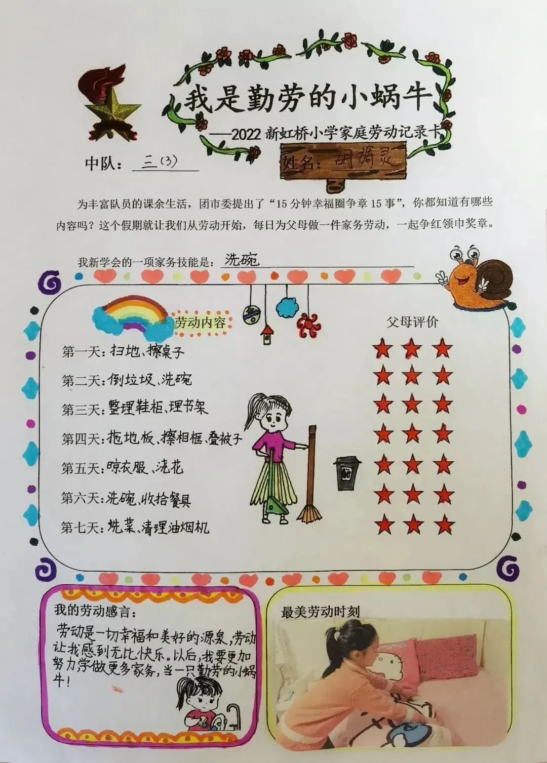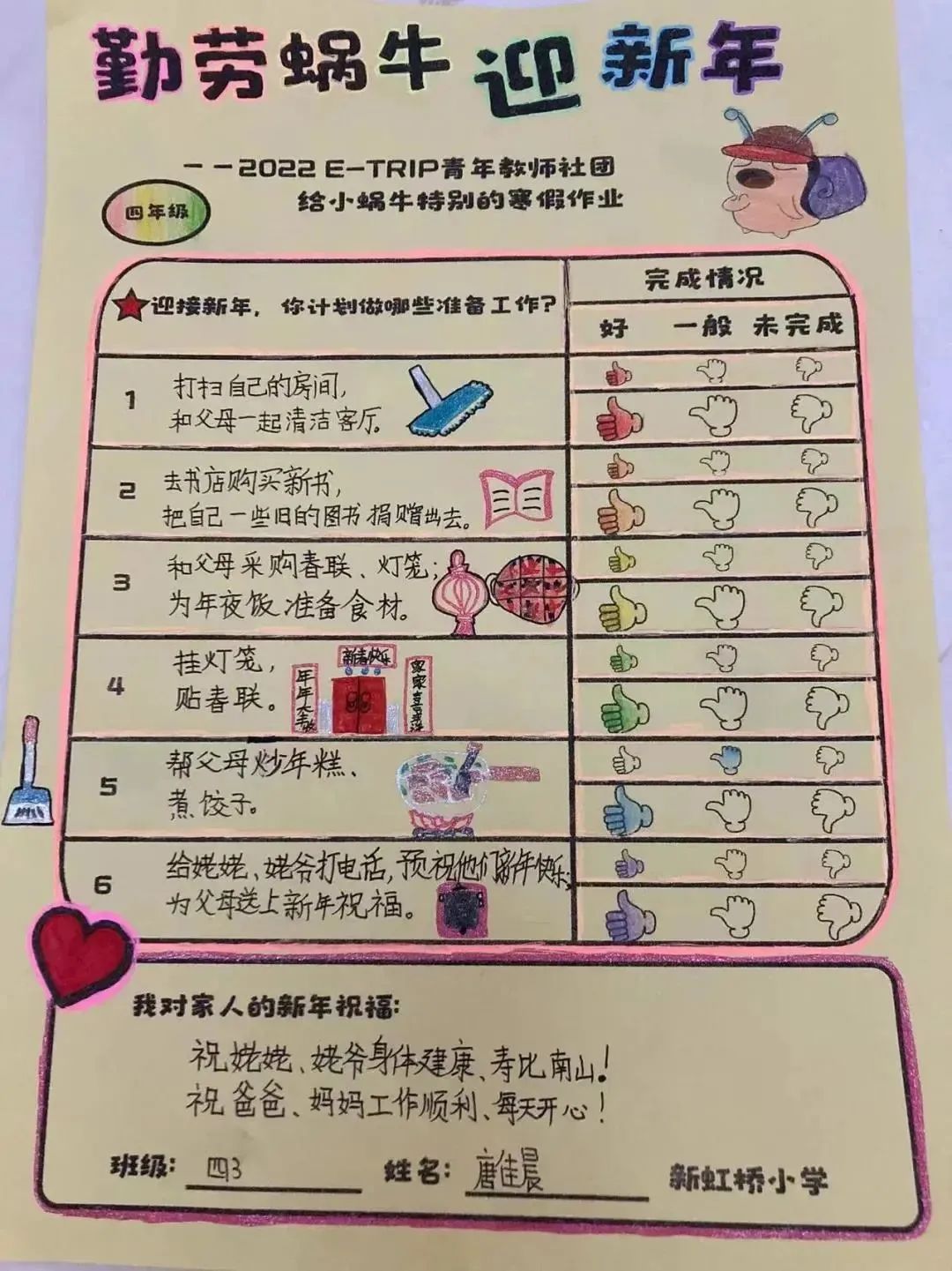 “我是勤劳的小蜗牛”“勤劳蜗牛迎新年”……这是新虹桥小学大队部及E-trip青年教师社团为学生设计的寒假特色作业单。“小蜗牛们”化身父母小帮手,主动分担家务劳动,努力做到家里的事情帮着做,不会的事情学着做,和爸爸妈妈一起和和美美过新年。