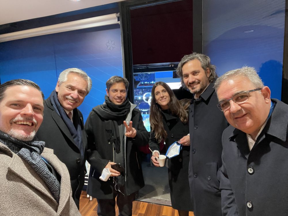 2月4日晚,阿根廷驻华大使牛望道与阿根廷总统费尔南德斯(左二)一行在北京冬奥会开幕式自拍。图片由阿根廷驻华大使馆提供