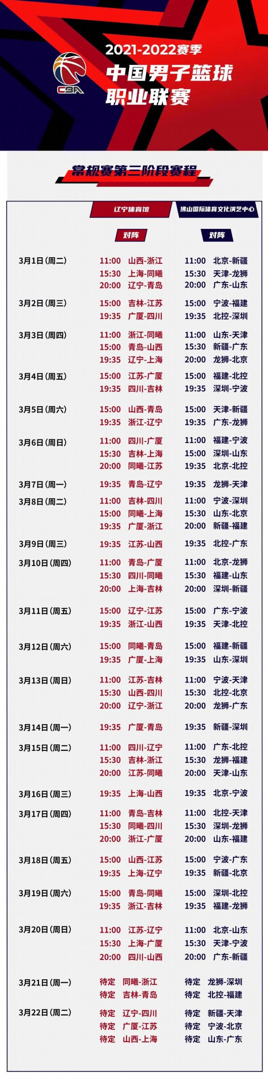 2月14日,CBA官方发布公告,宣布常规赛第三阶段将于3月1日-3月22日在沈阳赛区和顺德赛区举行,随后CBA官方公布了第三阶段的完整赛程。
