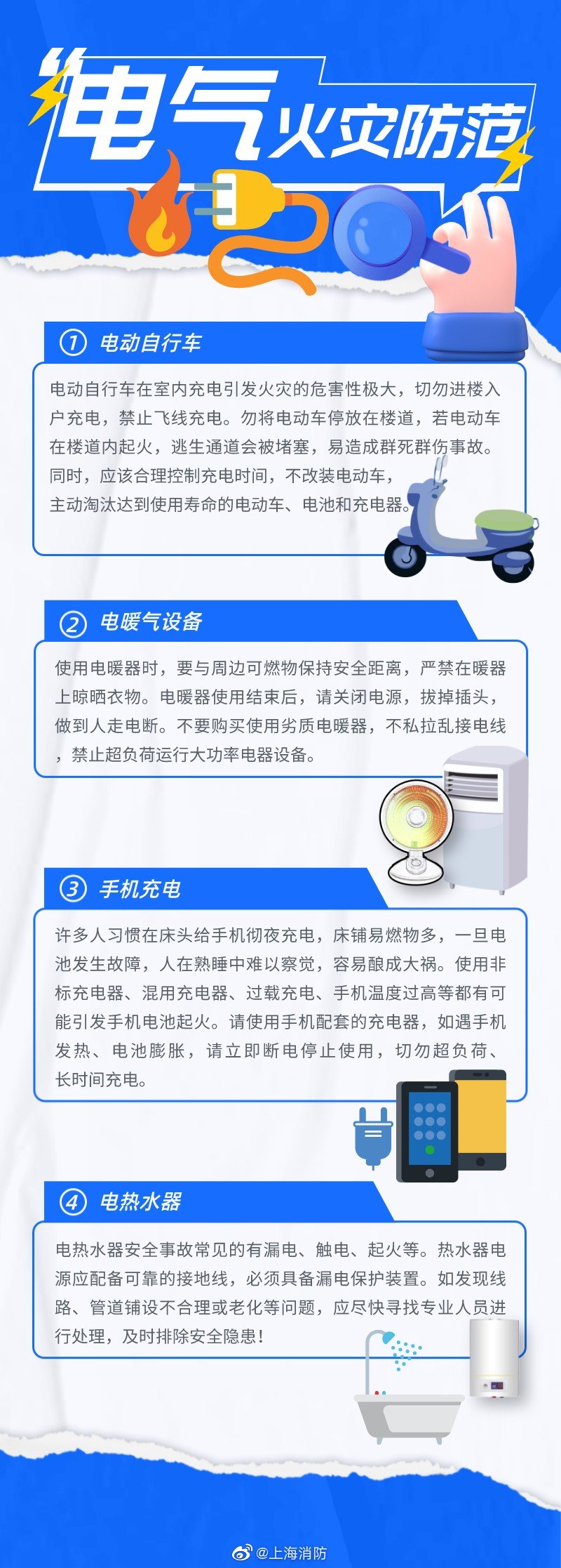近期上海气温较为平稳,最低气温2~5℃,最高气温6~9℃。低温天气用电取暖,要注意哪些消防安全事项?大功率电器扎堆使用、私拉乱接电线、老化线路超龄服役,小心“电气火灾”找上门。