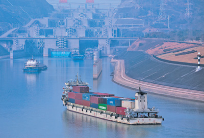 满载物资的货船经过三峡大坝船闸后,在湖北省宜昌市水域平稳航行。黄善军摄(影像中国)