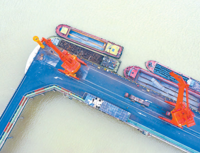 长江和鄱阳湖交汇处的江西省九江市湖口县,码头正在桥吊作业。张 玉摄(影像中国)