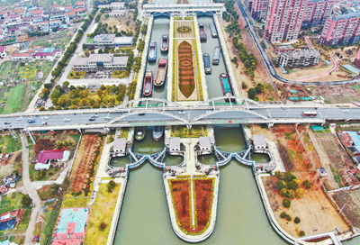 江苏省南通市,连申线(连云港至上海)航道上的船舶陆续通过海安船闸。许丛军摄(人民视觉)