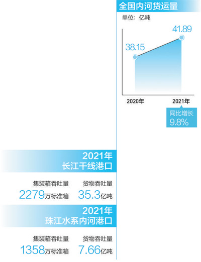 目前,我国基本建成了以长江干线、西江航运干线、京杭运河、长三角和珠三角高等级航道网为主体,干支衔接、通江达海的内河航道体系,为内河航运发展提供了有力支撑——2021年,全国内河货运量41.89亿吨,稳居世界第一,同比增长9.8%,两年平均增长3.5%。