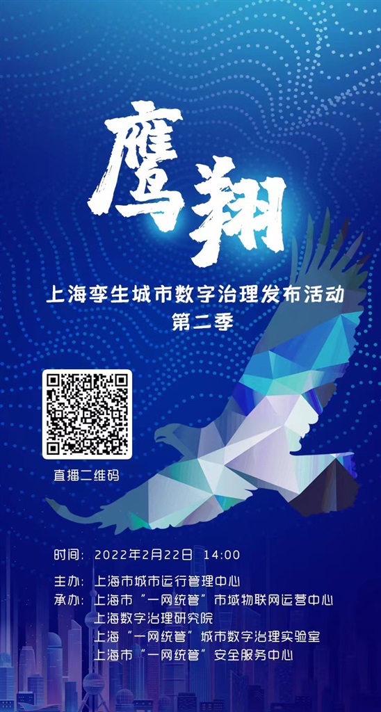 上海市城市运行管理中心将于2022年2月22日(周二)14:00-15:30举行“鹰翔—上海孪生城市数字治理”发布活动第二季。 届时欢迎扫码浏览直播。